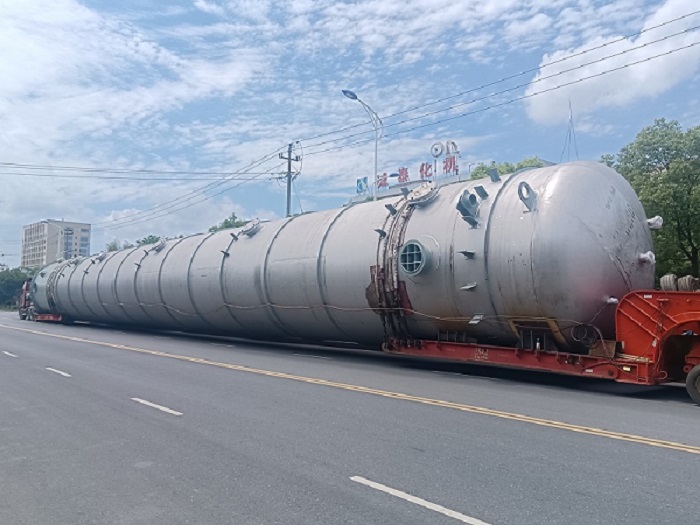 特別值得一提的是,反萃塔突破性采用整體運輸方案,徹底顛覆傳統分段制造再組裝的模式。通過量身定制的運輸工裝與科學嚴謹的路線規劃,該設備以近50米的運輸長度、超100噸的殼體重量(不含現場安裝內件),一舉刷新公司單體設備運輸紀錄。這一創新實踐實現了大型設備運輸技術的跨越,為同類項目實施提供了全新范例。